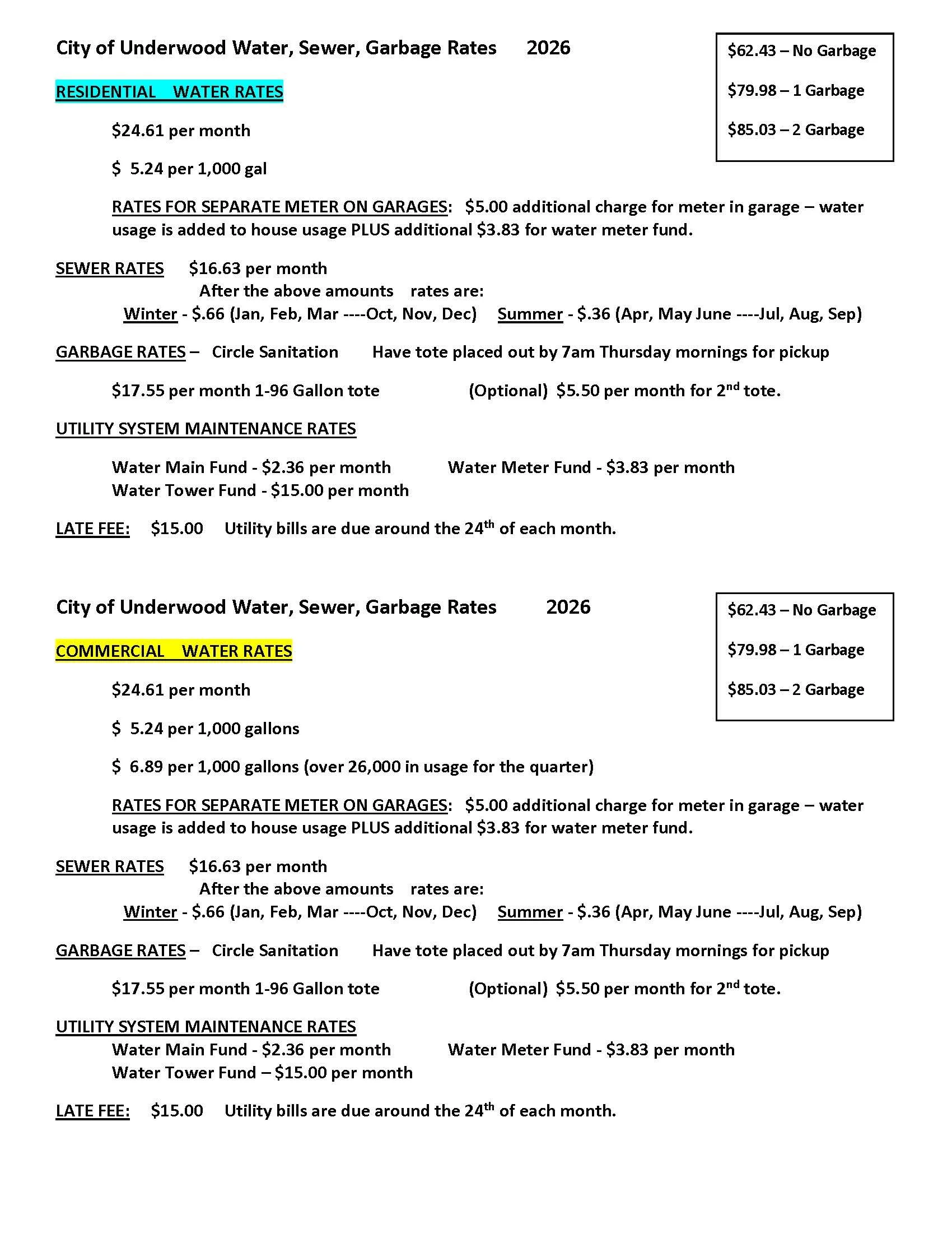 UTILITY BILLING AND RATES: 2026 Water, Sewer, Garbage: